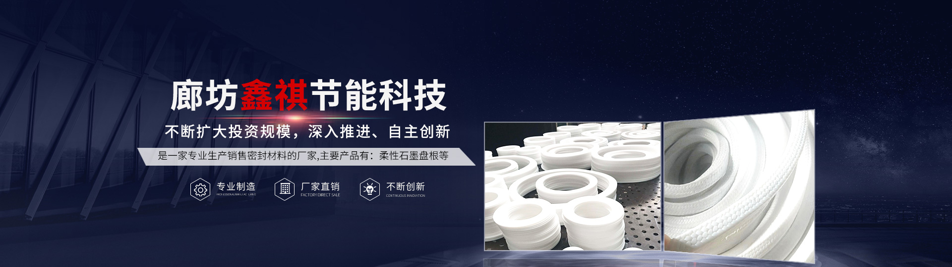 廊坊鑫祺節能科技有限公司成立于1998年,位于河北省廊坊市大城縣廣安工業區。是一家專業生產銷售密封材料的廠家。主要產品有:柔性石墨盤根,芳綸纖維盤根,碳素纖維盤根,碳素盤根,基本型、內外加強型金屬纏繞墊,四氟墊、板、棒、盤根,紫銅墊,鋼包墊,石墨復合墊,石棉、無石棉制品,碳素盤根,石墨盤根,芳綸盤根,高水基盤根,戈爾產品等。公司目前旗下有員工300人,年產銷500噸,年銷售收入近3000萬元。公司一貫堅持“質量率先,用戶至上,優質服務,信守合同”的宗旨,憑借著高質量的產品,良好的信譽,優質的服務,產品暢銷全國近三十多個省、市、自治區以及遠銷美國、俄羅斯等國家。竭誠與國內外商家雙贏合作,共同發展,共創輝煌!